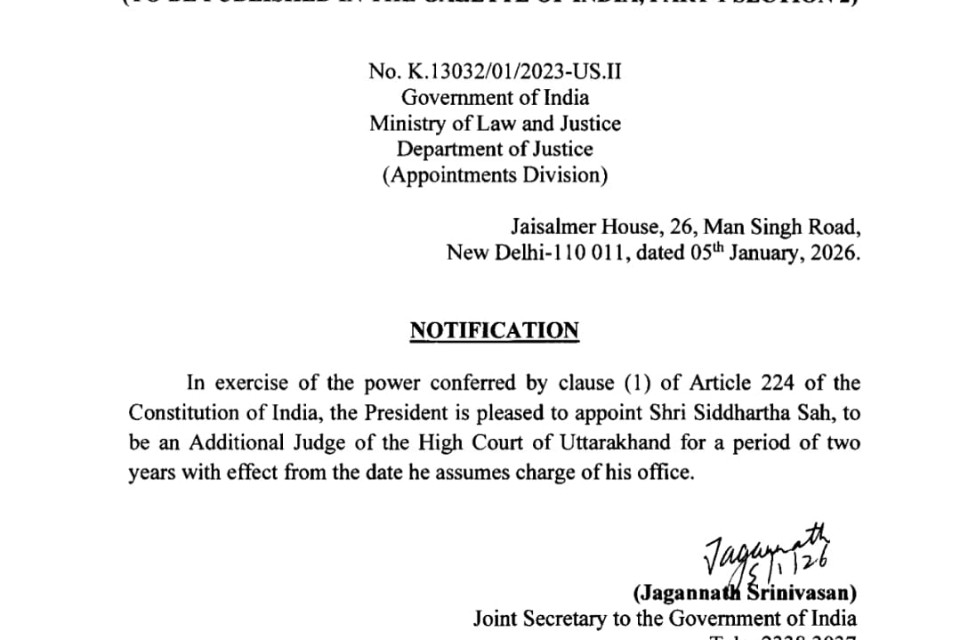 नैनीताल:उत्तराखंड हाईकोर्ट में जजों की संख्या बढ़ी,सिद्धार्थ साह बने हाईकोर्ट के अतिरिक्त न्यायाधीश