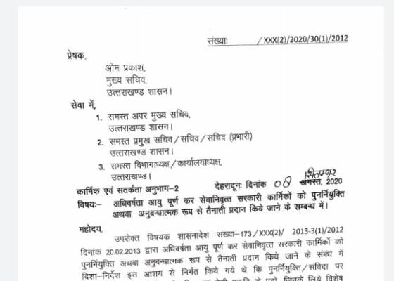 उत्तराखंड सरकार ने सरकारी कर्मचारियों के रिटायर होने के बाद उन्हें पुनर्नियुक्ति या संविदा पर रखने की मनमानी पर लगाम कस दी है।कई विभागों में अफसर मनमाने ढंग से अपने चहेतों को पुनर्नियुक्ति देकर सरकार पर आर्थिक बोझ बढ़ा रहे हैं।अलग अलग पद नामों से विभागों में इस तरह की नियुक्तियों का खेल चल रहा है।इस पर नकेल कसने के लिए मंगलवार को मुख्य सचिव ओम प्रकाश ने अनियमित अनुबंध नियुक्तियों के खिलाफ शासनादेश जारी किया है।अब कोई भी नियुक्ति कार्मिक एवम सतर्कता विभाग की अनुमति के बिना नहीं होगी।बेहद अनिवार्य होने पर ही कार्मिक विभाग अनुमति देगा। लेकिन उसके लिए कड़ी शर्तें तय की गई हैं।शासन को भेजे जाने वाले प्रस्ताव में संबंधित विभाग को प्रमाण पत्र देना होगा कि अनुबंध या पुनर्नियुक्ति पर पद को भरा जाना क्यों आवश्यक है।विभाग में कार्यरत अन्य किसी कार्मिक के सबंधित पद पर काम करने के लिए सक्षम न होने पर ही शासन अनुमति देगा।इतना ही नहीं अनुमति केवल 6 माह या अधिकतम एक साल के लिए होगी।जिन विभागों में विभागाध्यक्ष या अपर विभागाध्यक्ष के पद पूर्ण रूप से भरे हैं,वहां पुनर्नियुक्ति नहीं दी जाएगी।जिन विभागों में रिटायरमेंट की उम्र 62 वर्ष है वहां किसी भी स्थिति में पुनर्नियुक्ति नहीं दी जा सकती।बिना कार्मिक विभाग के पुनर्नियुक्ति देेने वाले अफसरों पर कार्रवाई होगी।सरकार ने अनियमित पुनर्नियुक्ति को कदाचार की श्रेणी में रखा है और नियुक्ति देने वाले संबंधित अधिकारी की वेतन से वसूली होगी।