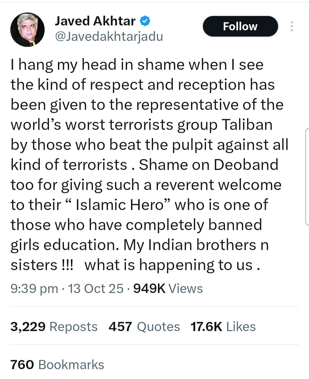 बॉलीवुड के मशहूर गीतकार जावेद अख्तर ने भी मुत्तकी के देवबंद दौरे के स्वागत पर शर्म जताते हुए कहा कि एक तालिबानी मंत्री को भारत में इस तरह सम्मान देना शर्मनाक है।