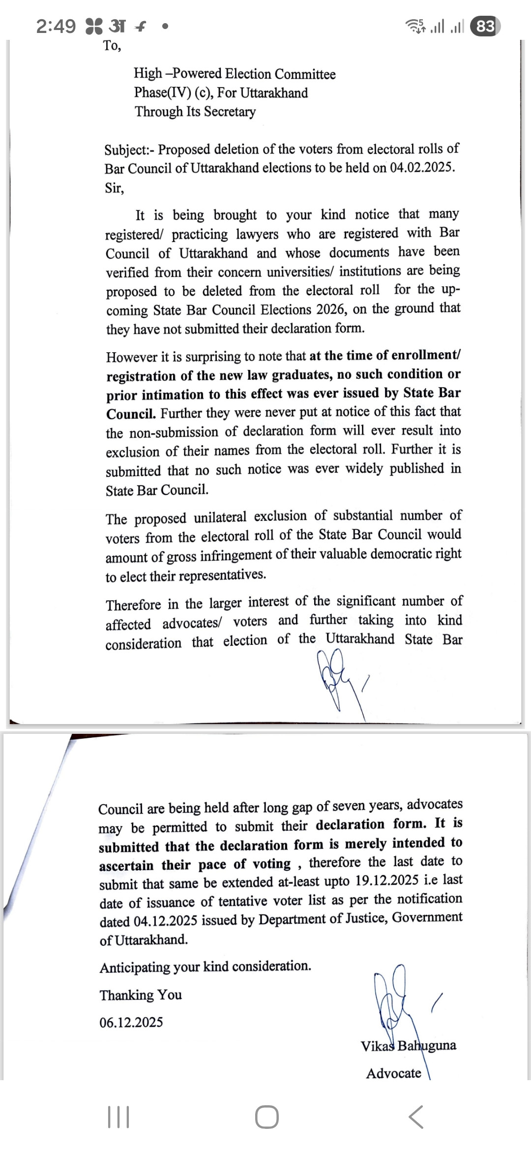 पत्र में इस बात पर भी जोर दिया गया है कि नए लॉ ग्रेजुएट्स के एनरोलमेंट या रजिस्ट्रेशन के समय स्टेट बार काउंसिल द्वारा डिक्लेरेशन फॉर्म को लेकर न तो कोई शर्त रखी गई थी और न ही पूर्व में कोई सार्वजनिक सूचना जारी की गई थी। इसके अलावा अधिवक्ताओं का यह भी कहना है कि इस तरह का कोई नोटिस बड़े स्तर पर प्रकाशित नहीं किया गया, जिससे हजारों योग्य मतदाता इस नियम से अनजान रह गए। विकास बहुगुणा ने यह भी उल्लेख किया कि उत्तराखंड स्टेट बार काउंसिल के चुनाव लगभग सात साल के लंबे अंतराल के बाद होने जा रहे हैं। ऐसे में बड़ी संख्या में वकीलों को वोट से वंचित करना गंभीर और अनुचित निर्णय होगा। उन्होंने मांग की कि सभी प्रभावित अधिवक्ताओं को डिक्लेरेशन फॉर्म जमा करने का एक और अवसर दिया जाए, ताकि किसी का भी संवैधानिक और लोकतांत्रिक अधिकार न छीना जाए।
