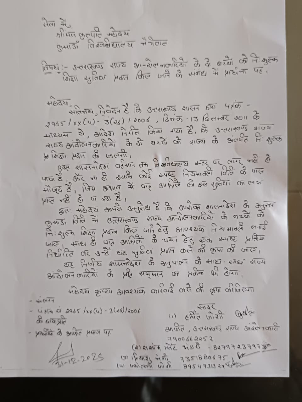 मुख्यमंत्री के स्पष्ट निर्देशों और शासनादेश के बावजूद कुमाऊँ विश्वविद्यालय में उत्तराखंड राज्य आंदोलनकारियों के बच्चों को निशुल्क शिक्षा का लाभ अब तक लागू नहीं किया गया है। इसी को लेकर सरोवर नगरी नैनीताल स्थित डीएसबी कॉलेज में अध्ययनरत राज्य आंदोलनकारियों के आश्रित छात्रों को कुलपति को ज्ञापन सौंपकर आदेश की याद दिलानी पड़ी।