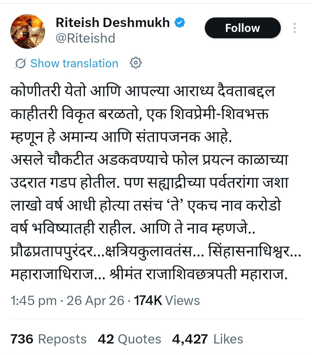 रितेश देशमुख ने आगे लिखा कि शिवाजी महाराज को किसी सीमित दायरे में बांधने के प्रयास व्यर्थ हैं और समय के साथ समाप्त हो जाएंगे, लेकिन उनका नाम और गौरव सदियों तक अमर रहेगा। उन्होंने अपने पोस्ट में शिवाजी महाराज के प्रति गहरी श्रद्धा व्यक्त करते हुए उन्हें ‘प्रताप पुरंदर’, ‘क्षत्रिय कुल-भूषण’ और ‘सम्राटों के भी सम्राट’ बताया।
