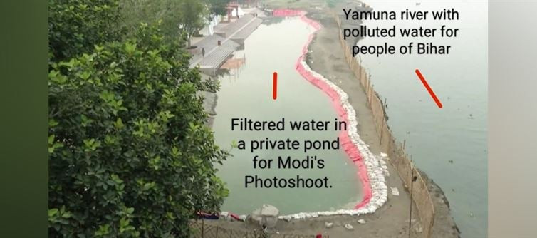बिहार विधानसभा चुनाव से पहले छठ पूजा के दौरान भारतीय जनता पार्टी (बीजेपी) पर एक चौतरफा घिरती नजर आ रही है। अब बीजेपी पर आरोप लग रहा है कि बिहार के वोटरों को प्रभावित करने के लिए प्रधानमंत्री नरेंद्र मोदी के लिए एक नकली यमुना और उसके किनारे एक कृत्रिम घाट का निर्माण किया गया है,अब इस नकली यमुना की फोटो और वीडियो सोशल मीडिया में तेजी से वायरल हो रही है। यह नकली यमुना जी का घाट विशेष रूप से पीएम मोदी के छठ कार्यक्रम के लिए तैयार किया गया है। यहीं पीएम मोदी छठ मनाएंगे। सबसे चौंकाने वाला दावा यह है कि इस कृत्रिम जलाशय में गंगा जी का पीने वाला (फिल्टर किया हुआ) पानी भरा गया है।
