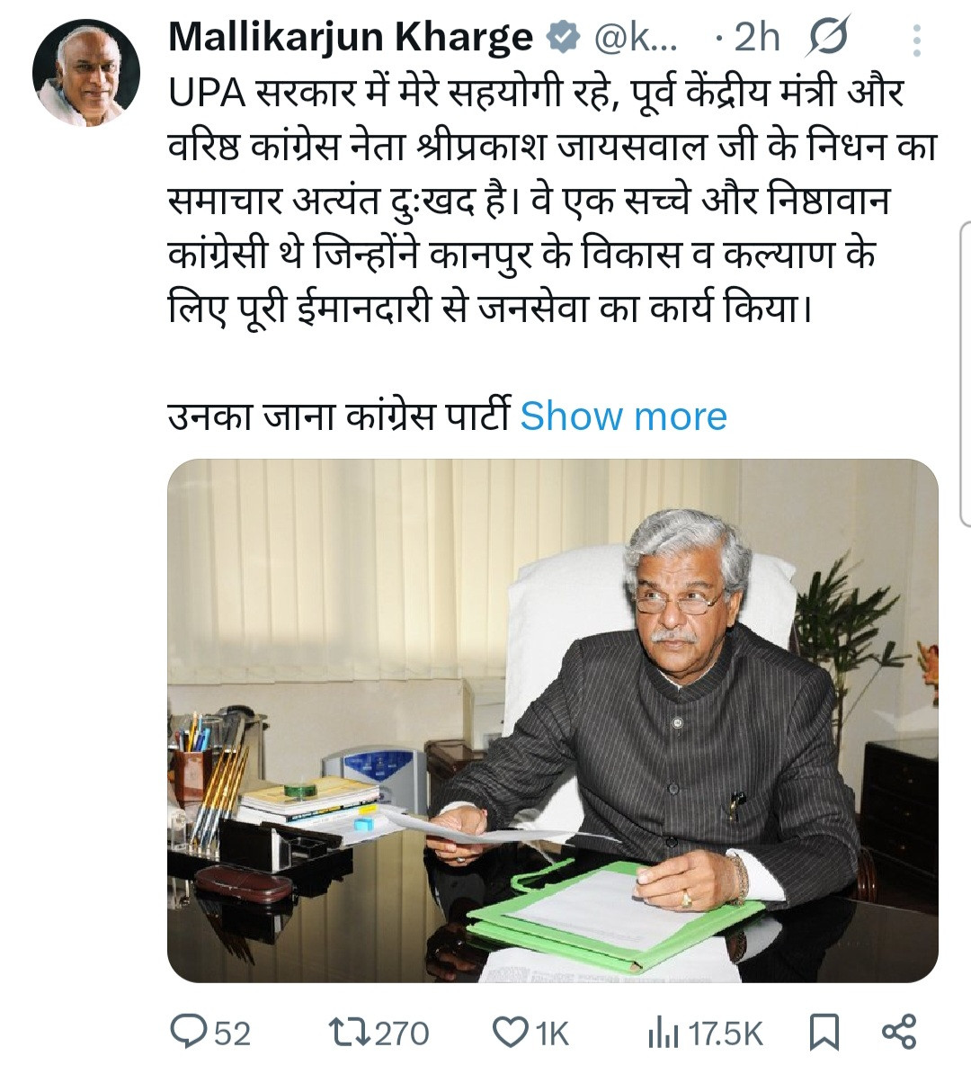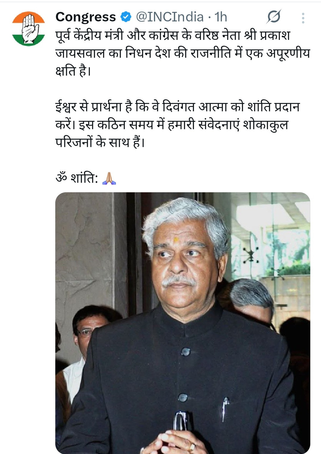 श्रीप्रकाश जायसवाल के निधन की पुष्टि कांग्रेस के X पर आधिकारिक पेज ने भी की है और उनके निधन पर शोक संवेदना व्यक्त की है