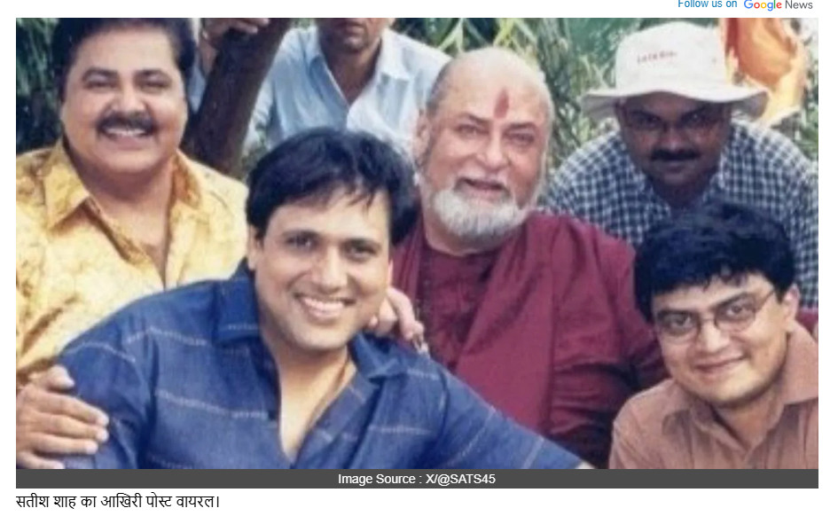 नई दिल्ली। दिग्गज अभिनेता सतीश शाह का निधन हो गया है। उन्होंने 74 वर्ष की आयु में दुनिया को अलविदा कहा। वह किडनी संबंधी स्वास्थ्य समस्याओं से जूझ रहे थे और हिंदुजा अस्पताल में भर्ती थे। लेकिन अचानक उनकी हालत बिगड़ गई और किडनी फेल होने के कारण उनका निधन हो गया। उनके निधन से पूरी इंडस्ट्री में मातम पसर गया है। कई सितारों ने सोशल मीडिया के जरिए उनके निधन पर शोक व्यक्त किया है। इस बीच सोशल मीडिया पर सतीश शाह का भी आखिरी पोस्ट वायरल हो रहा, जिसके जरिए उन्होंने दिग्गज अभिनेता को याद किया था। उन्होंने निधन से ठीक एक दिन पहले एक्स पर एक ग्रुप फोटो शेयर की थी, जिसमें उनके साथ गोविंदा, शम्मी कपूर और कुछ अन्य स्टार नजर आ रहे हैं। इस फोटो को शेयर करते हुए सतीश शाह ने शम्मी कपूर को याद किया। दरअसल, 21 अक्टूबर को शम्मी कपूर का जन्मदिन था, इसी मौके पर सतीश शाह ने ये पोस्ट शेयर किया था। अपने पोस्ट में उन्होंने लिखा था ‘जन्मदिन मुबारक हो शम्मी जी, आप हमेशा मेरे आस-पास रहेंगे।