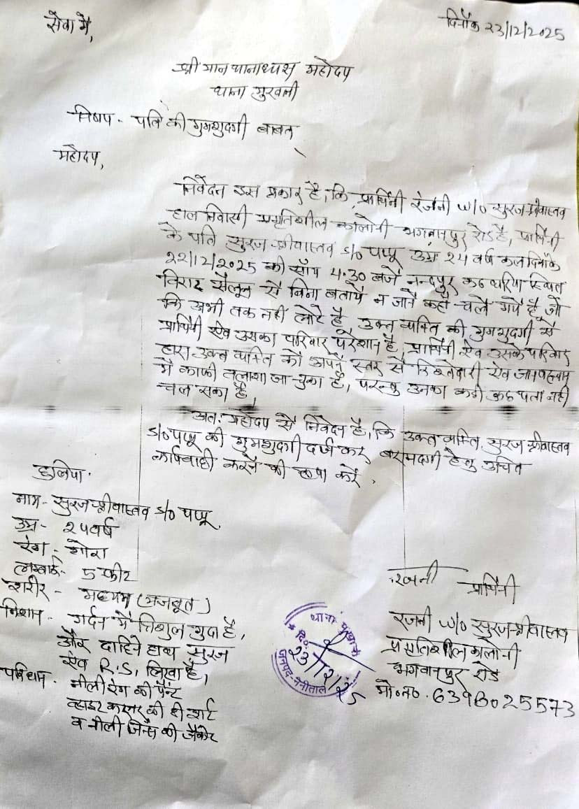 हल्द्वानी। हल्द्वानी में एक महिला पिछले 7 दिनों से अपने पति की तलाश में दर-दर भटक रही है, लेकिन इतने दिन बीतने के बावजूद उसके पति का कहीं कोई पता नहीं चल पा रहा है। इस मामले में महिला द्वारा मुखानी थाने में गुमशुदगी को लेकर पत्र भी दिया गया है। मूलरूप से यूपी के मीरगंज निवासी रजनी ने बताया कि उसका विवाह मार्च 2024 में भोजीपुरा निवासी सूरज श्रीवास्तव के साथ हुआ था। बताया कि इसी साल सितंबर, 2025 में वह अपने पति और बच्चे के साथ हल्द्वानी आ गयी थी और यहीं पर काम-धंधा कर गुजर-बसर करने लगे। रजनी के मुताबिक वह हल्द्वानी के प्रगतिशील कॉलोनी, भगवानपुर रोड में रहती हैं और उनके पति सूरज श्रीवास्तव ने नंदपुर, कठघरिया में विराट सैलून के नाम से एक दुकान खोली थी। पुलिस को दिए पत्र में रजनी ने बताया कि विगत 22 दिसंबर 2025 को शाम के साढ़े चार बजे उनके पति सूरज श्रीवास्तव बिना बताए कहीं चले गए और अभी तक वापस नहीं लौटे हैं। कहा कि काफी खोजबीन के बावजूद पति का कहीं पता नहीं चल पा रहा है, जिसके चलते वह काफी परेशान है।
