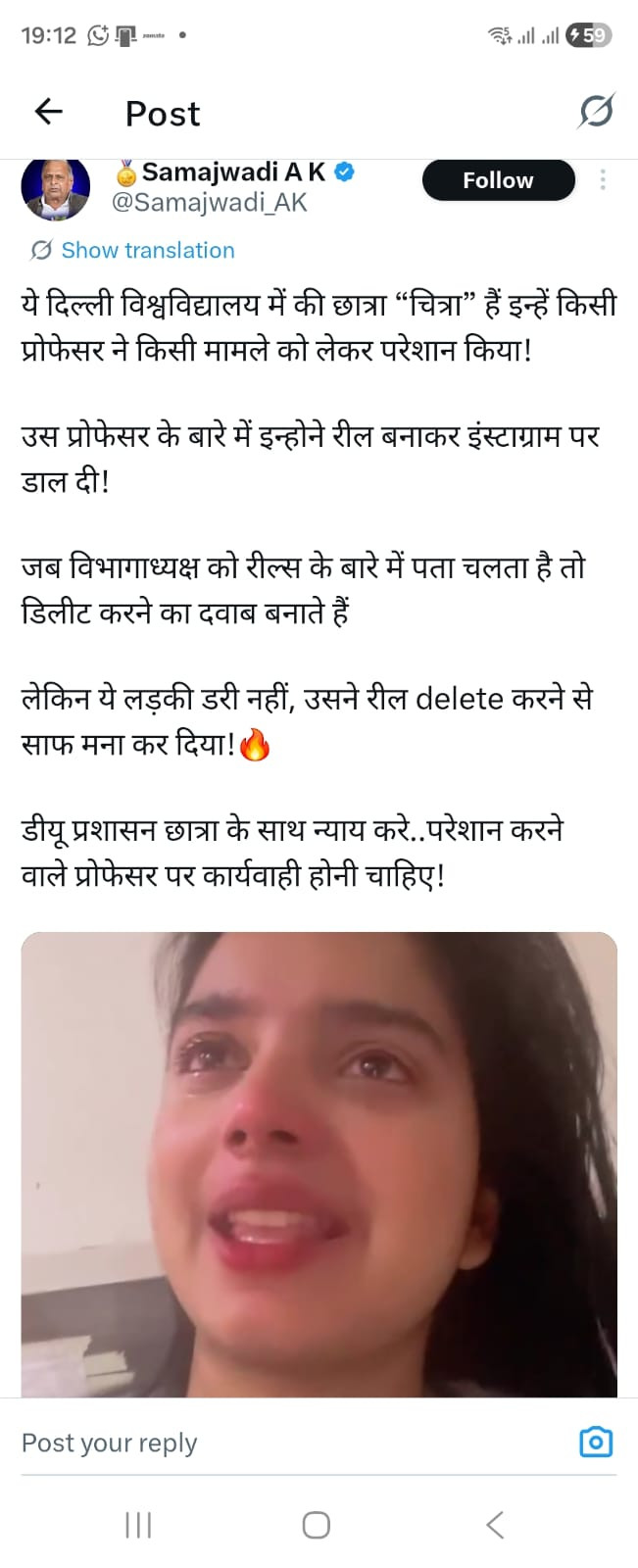 दिल्ली विश्वविद्यालय (डीयू) की एक छात्रा ने अपने विभाग के एक प्रोफेसर पर उत्पीड़न और मानसिक प्रताड़ना के गंभीर आरोप लगाए हैं। छात्रा द्वारा रिकॉर्ड किया गया एक वीडियो सोशल मीडिया पर तेजी से वायरल हो रहा है, जिसे समाजवादी पार्टी ने भी अपने आधिकारिक X (पूर्व में ट्विटर) हैंडल पर साझा किया है। इसके बाद मामला सार्वजनिक चर्चा में आ गया है।