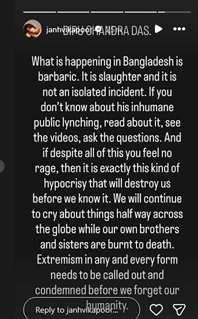 बांग्लादेश में हिंदू युवक की हत्या पर जान्हवी कपूर का बयान! बोलीं यह नरसंहार है, इंसानियत खतरे में है! कट्टरपंथ और चरमपंथ पर उठाए सवाल