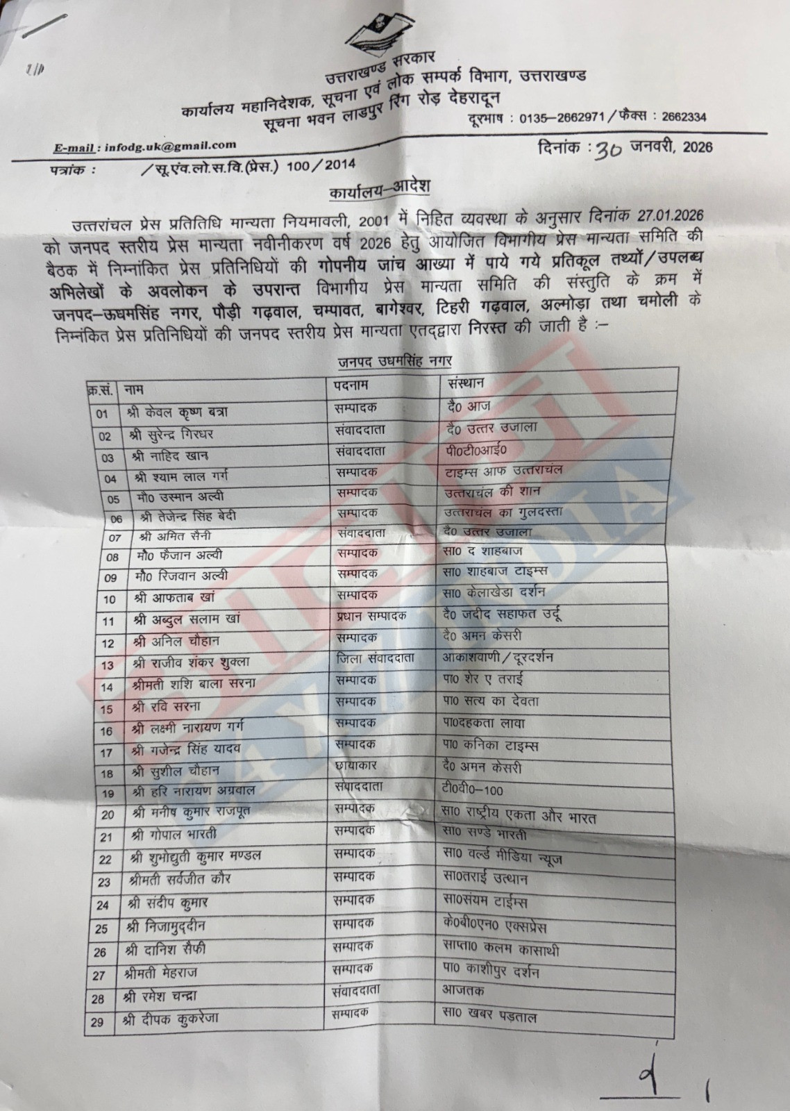 उत्तराखण्ड में प्रेस मान्यता पर बड़ी कार्रवाईः ऊधम सिंह नगर जिले के 29 पत्रकारों की मान्यता निरस्त, लिंक में देखें पूरी लिस्ट