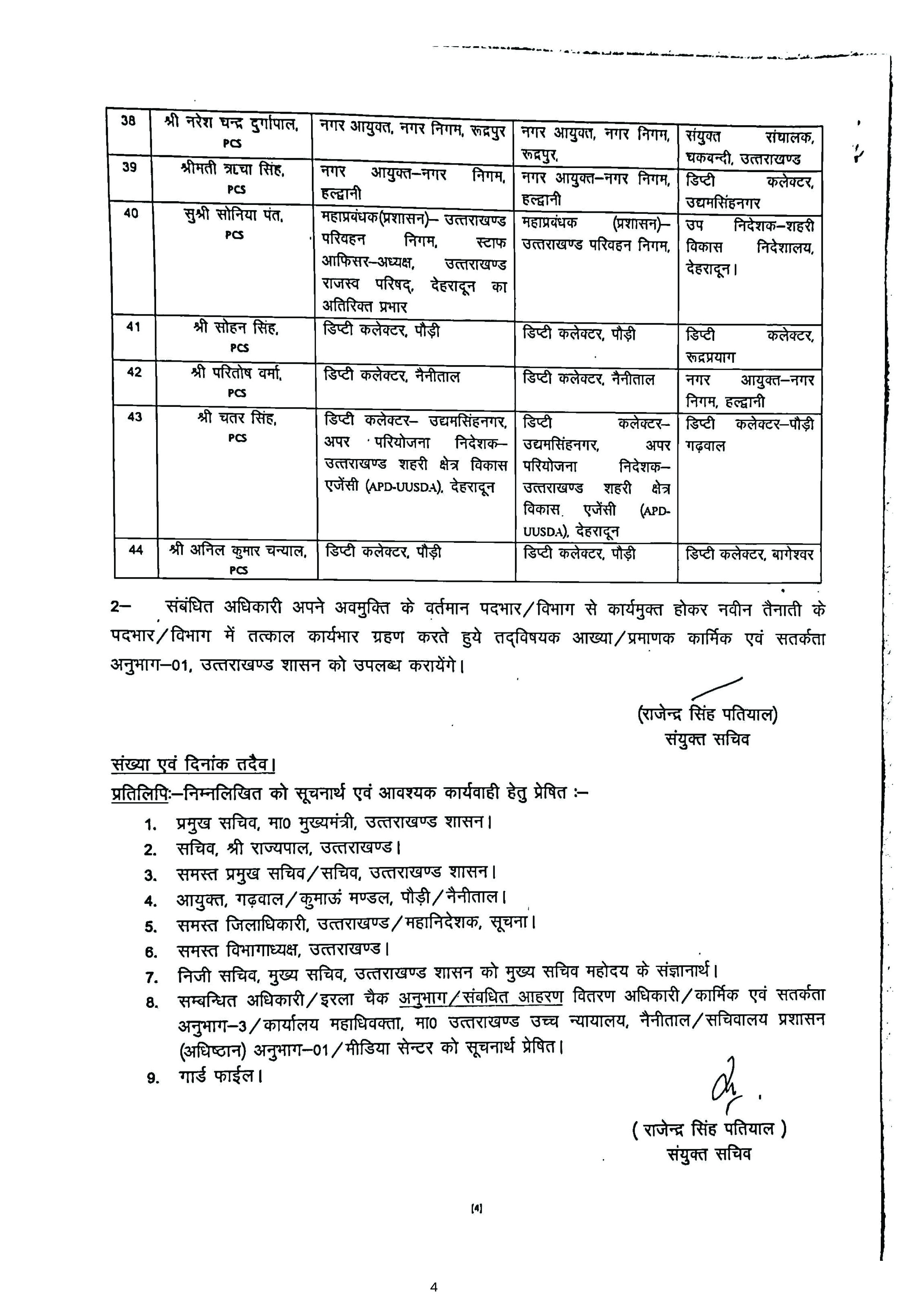 देहरादून। उत्तराखण्ड में एक बार फिर बड़ा प्रशासनिक फेरबदल हुआ है। शासन ने आज रविवार, 12 अक्टूबर को 44 आईएएस, आईएफएस और पीसीएस अफसरों के तबादले किए हैं। इस दौरान आईएएस ललित मोहन रयाल को नैनीताल का नया जिलाधिकारी बनाया गया है। वहीं आईएएस गौरव कुमार को जिलाधिकारी चमोली, आईएएस अंशुल सिंह को जिलाधिकारी अल्मोड़ा और आईएएस आकांक्षा को जिलाधिकारी बागेश्वर बनाया गया है। वहीं आशीष कुमार भटगाई को जिलाधिकारी पिथौरागढ़ बनाया गया है। आईएफएस पराग मधुकर धकाते को विशेष सचिव पंचायती राज बनाया गया है।