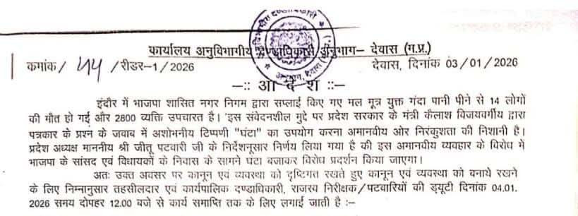 नई दिल्ली। मध्य प्रदेश में इन दिनों ‘घंटा’ शब्द को लेकर सियासी घमासान मचा हुआ है। पिछले दिनों मंत्री कैलाश विजयवर्गीय ने एक पत्रकार के सवाल के जवाब में ‘घंटा’ शब्द का इस्तेमाल किया था, जिसके बाद प्रदेश की सियासत गरमाई हुई है। मंत्री द्वारा इस प्रकार की टिप्पणी किए जाने को लेकर जहां लोगों में आक्रोश है, वहीं कांग्रेस इस मुद्दे को लेकर आक्रामक मोड पर नजर आ रही है। अब इसी विवाद के बीच एक सरकारी आदेश में भी ‘घंटा’ शब्द का जिक्र होने पर मामला और गरमा गया है। हांलाकि मामला गरमाने के बाद एसडीएम आनंद मालवीय को सस्पेंड कर दिया गया है। उज्जैन संभाग आयुक्त आशीष सिंह ने इस संबंध में निलंबन का आदेश जारी किया है। दरअसल कुछ दिन पहले मध्य प्रदेश के देवास में कानून व्यवस्था बनाए रखने को लेकर एसडीएम आनंद मालवीय ने एक आदेश जारी किया था। इस आदेश में कांग्रेस के प्रस्तावित विरोध प्रदर्शन का उल्लेख करते हुए शांति व्यवस्था सुनिश्चित करने की बात कही गई थी। हालांकि इसी आदेश में उन्होंने मंत्री कैलाश विजयवर्गीय की विवादित ‘घंटा’ टिप्पणी का भी जिक्र कर दिया। प्रशासनिक हलकों का मानना है कि सरकारी आदेशों में इस तरह की भाषा या शब्दों का इस्तेमाल नहीं किया जाना चाहिए। इसी को लेकर कांग्रेस ने आपत्ति जताई और जमकर बवाल मचा। आज तक की रिपोर्ट के मुताबिक आदेश का एक हिस्सा ऐसा भी था, जिसमें कांग्रेस के ज्ञापन की भाषा लगभग शब्दशः कॉपी कर दी गई थी। इस पर भी गंभीर आपत्ति उठाई गई। जब यह आदेश सोशल मीडिया पर वायरल हुआ, तो प्रशासन हरकत में आया और एसडीएम आनंद मालवीय को तत्काल प्रभाव से निलंबित कर दिया गया। इसके साथ ही देवास कलेक्टर ऋतुराज सिंह ने सहायक ग्रेड-3 अमित चौहान के खिलाफ भी कार्रवाई करते हुए उन्हें भी तत्काल प्रभाव से निलंबित कर दिया। प्रशासन की ओर से यह संदेश देने की कोशिश की गई है कि सरकारी दस्तावेजों में किसी भी तरह की आपत्तिजनक या गैर-प्रशासनिक भाषा बर्दाश्त नहीं की जाएगी। फिलहाल देवास को नया एसडीएम मिल गया है। अभिषेक शर्मा को यह जिम्मेदारी सौंपी गई है, ताकि प्रशासनिक भाषा और प्रक्रियाओं का पूरी तरह पालन सुनिश्चित किया जा सके।
