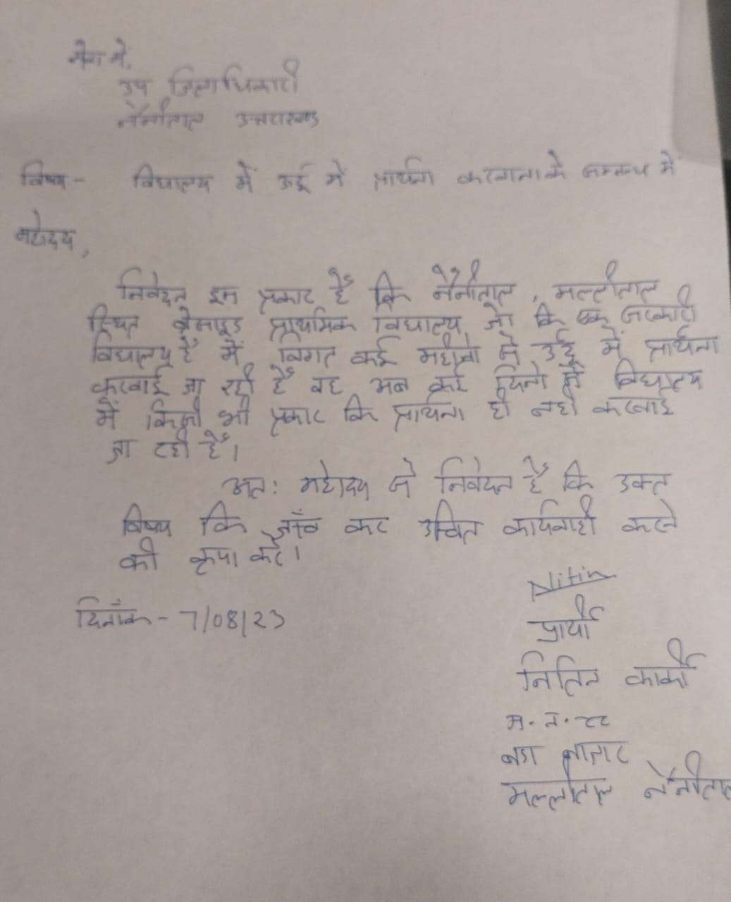 सरोवर नगरी नैनीताल के एक सरकारी स्कूल में उर्दू में प्रार्थना करवाने का मामला सामने आया है। इस सम्बंध में नैनीताल हाईकोर्ट के अधिवक्ता और बीजेपी युवा मोर्चा के पूर्व जिला अध्यक्ष नितिन कार्की ने नैनीताल एसडीएम राहुल शाह को एक ज्ञापन सौंपा है।
