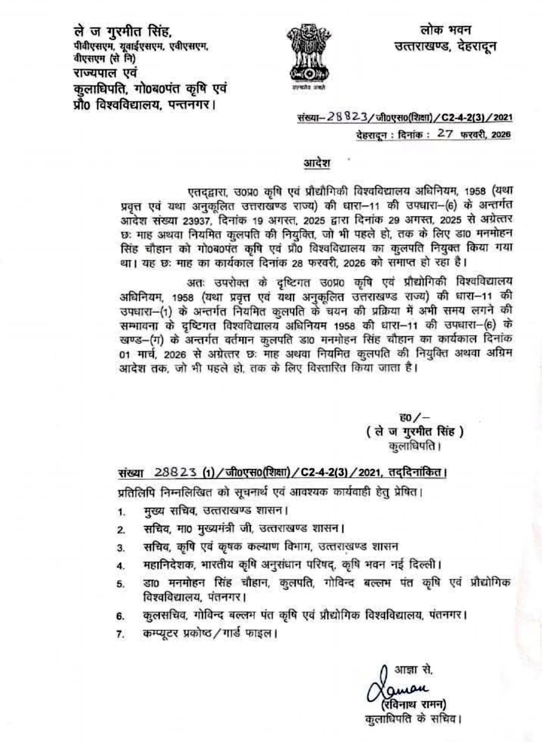 पंतनगर यूनिवर्सिटी ब्रेकिंगः फिर बढ़ा कुलपति डॉ. मनमोहन सिंह चौहान का कार्यकाल! आदेश जारी