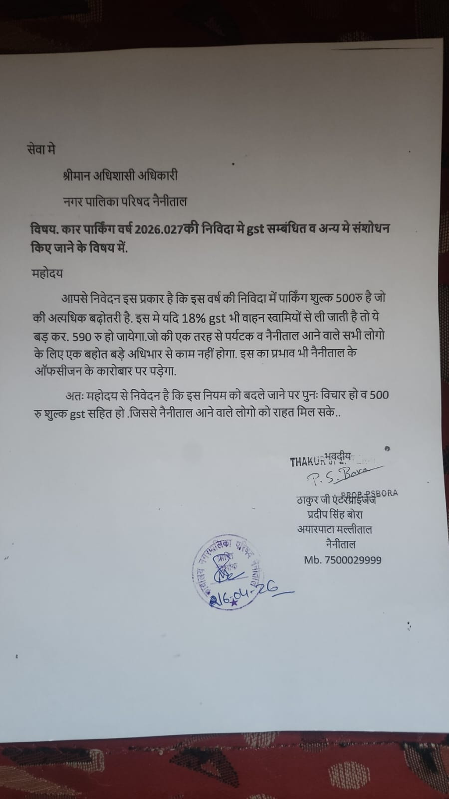 उन्होंने नगर पालिका से आग्रह किया है कि पार्किंग शुल्क ₹500 में ही जीएसटी को समाहित किया जाए, ताकि पर्यटकों और स्थानीय नागरिकों को अतिरिक्त भुगतान से राहत मिल सके।