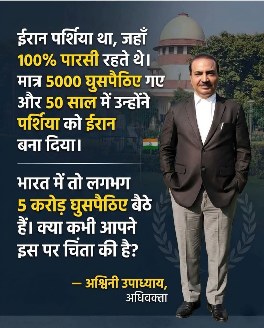 सुप्रीम कोर्ट के वरिष्ठ अधिवक्ता ने घुसपैठियों को लेकर जताई चिंता!इतिहास से सबक लेना जरूरी,जैसे ईरान बदल गया, वैसे ही भारत में खतरा