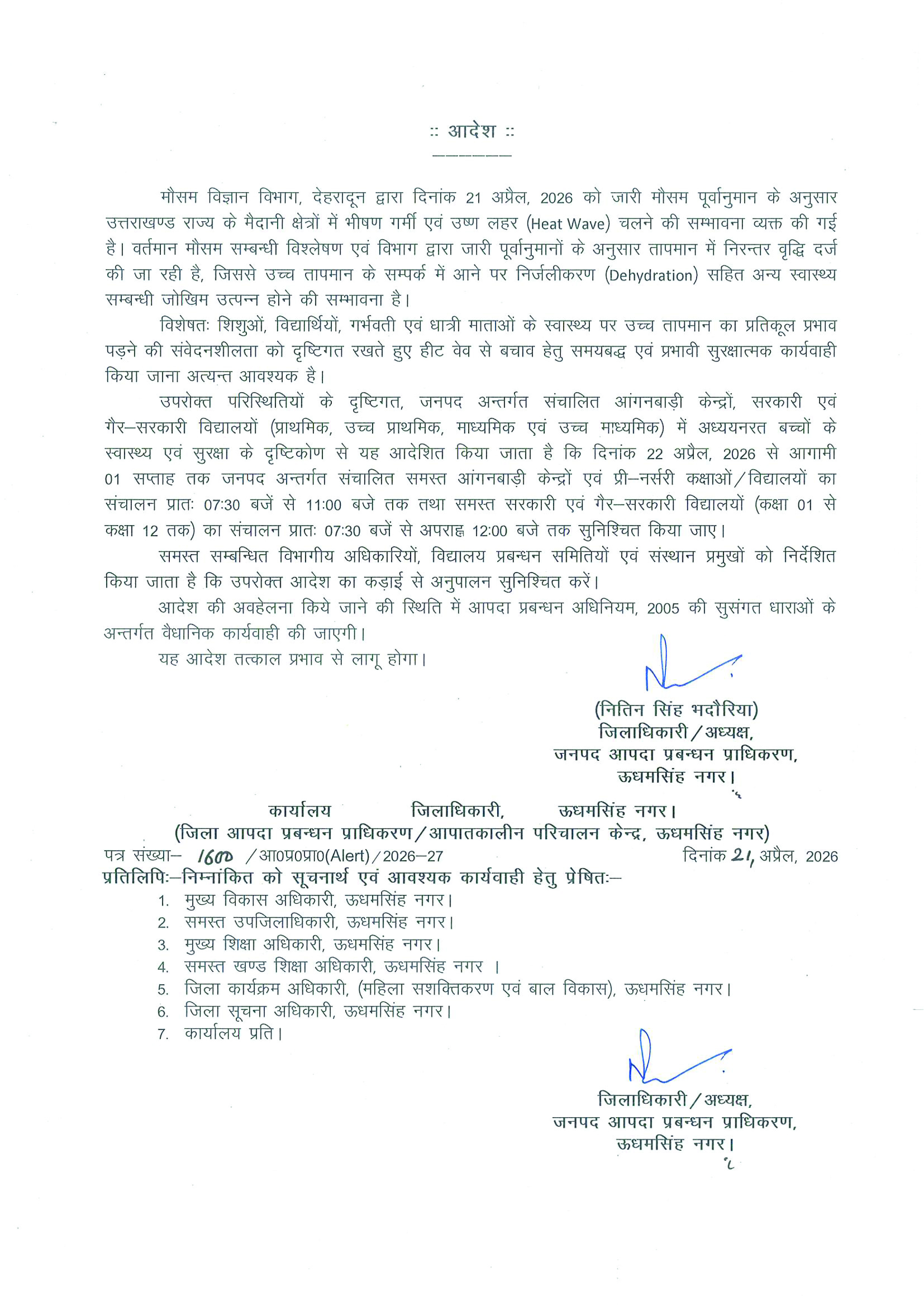 रुद्रपुर। लगातार बढ़ती गर्मी और हीट वेव के खतरे को देखते हुए ऊधम सिंह नगर जिला प्रशासन ने स्कूलों और आंगनबाड़ी केन्द्रों के समय में बदलाव करने का महत्वपूर्ण निर्णय लिया है। मौसम विज्ञान विभाग, देहरादून द्वारा जारी पूर्वानुमान के अनुसार राज्य के मैदानी क्षेत्रों में भीषण गर्मी और लू चलने की संभावना जताई गई है, जिसके चलते यह कदम उठाया गया है। जिलाधिकारी नितिन सिंह भदौरिया द्वारा जारी आदेश में कहा गया है कि तापमान में लगातार वृद्धि के कारण हीट वेव और डिहाइड्रेशन जैसी समस्याओं का खतरा बढ़ गया है। विशेष रूप से छोटे बच्चों, विद्यार्थियों, गर्भवती महिलाओं और धात्री माताओं पर इसका प्रतिकूल प्रभाव पड़ सकता है। इन्हीं परिस्थितियों को ध्यान में रखते हुए जनपद के सभी आंगनबाड़ी केंद्रों, प्री-नर्सरी कक्षाओं और विद्यालयों के संचालन समय में अस्थायी परिवर्तन किया गया है। आदेश के अनुसार 22 अप्रैल 2026 से आगामी एक सप्ताह तक आंगनबाड़ी केंद्र और प्री-नर्सरी कक्षाएं सुबह 7ः30 बजे से 11ः00 बजे तक संचालित होंगी। वहीं कक्षा 1 से 12 तक के सभी सरकारी और गैर-सरकारी विद्यालयों का समय सुबह 7ः30 बजे से दोपहर 12ः00 बजे तक निर्धारित किया गया है। जिलाधिकारी ने सभी संबंधित विभागों, विद्यालय प्रबंधन समितियों और संस्थान प्रमुखों को निर्देश दिए हैं कि आदेश का सख्ती से पालन सुनिश्चित किया जाए। साथ ही चेतावनी दी गई है कि आदेश की अवहेलना करने पर आपदा प्रबंधन अधिनियम 2005 के तहत कार्रवाई की जाएगी। प्रशासन ने अभिभावकों और नागरिकों से भी अपील की है कि बच्चों को गर्मी से बचाने के लिए आवश्यक सावधानियां बरतें और स्वास्थ्य का विशेष ध्यान रखें। यह आदेश तत्काल प्रभाव से लागू कर दिया गया है।