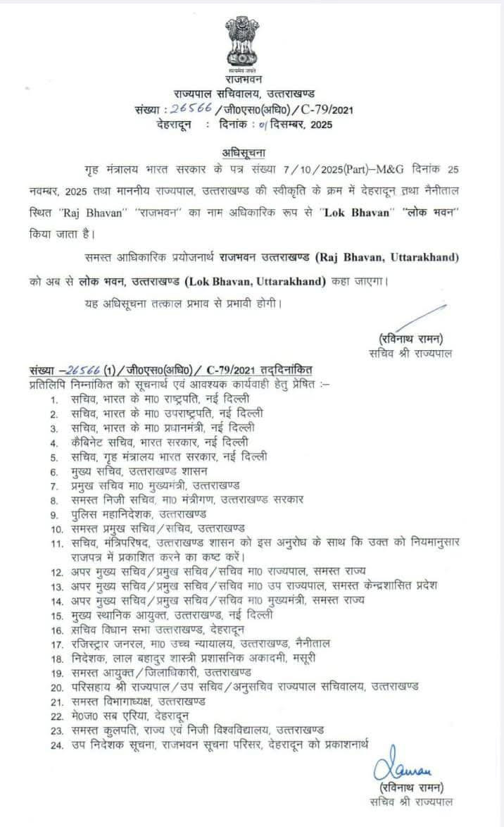 अधिसूचना में स्पष्ट किया गया है कि देहरादून और नैनीताल स्थित “Raj Bhavan / राजभवन” को अब समस्त शासकीय एवं प्रशासनिक प्रयोजनों के लिए “Lok Bhavan / लोक भवन” के नाम से जाना जाएगा। यह आदेश तत्काल प्रभाव से लागू हो गया है।