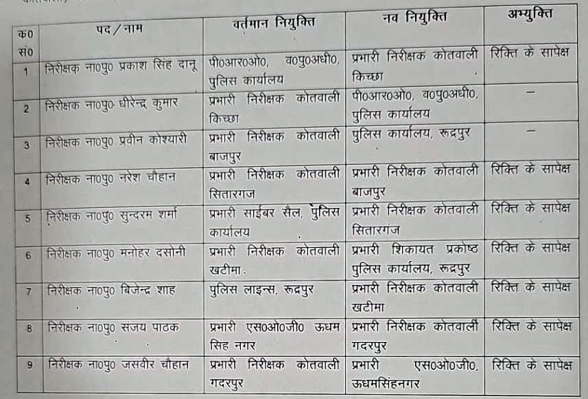 ऊधम सिंह नगर ब्रेकिंगः पुलिस महकमे में फेरबदल! कई निरीक्षकों के स्थानांतरण, जानें किसे कहां मिली तैनाती