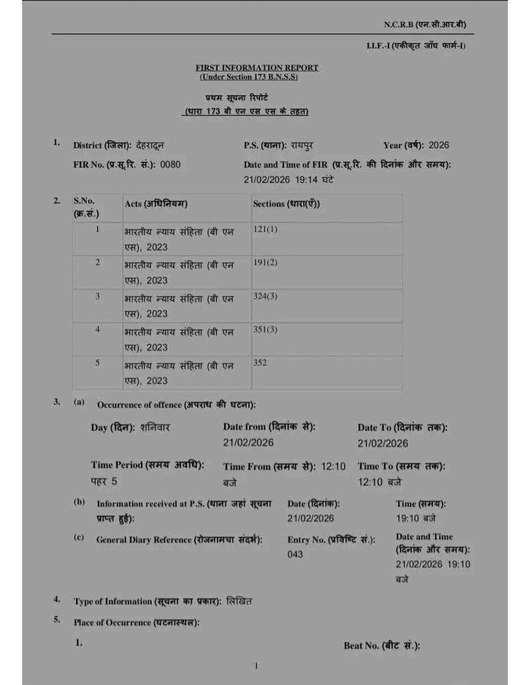 पुलिस ने भारतीय न्याय संहिता (BNS) 2023 की धाराओं 121(1), 191(2), 324(3), 351(3) और 352 के तहत मामला दर्ज किया है। पुलिस अधिकारियों का कहना है कि प्रकरण की निष्पक्ष जांच की जा रही है और साक्ष्यों व बयान के आधार पर आगे की वैधानिक कार्रवाई की जाएगी। मामले ने प्रदेश की राजनीति में भी हलचल पैदा कर दी है।