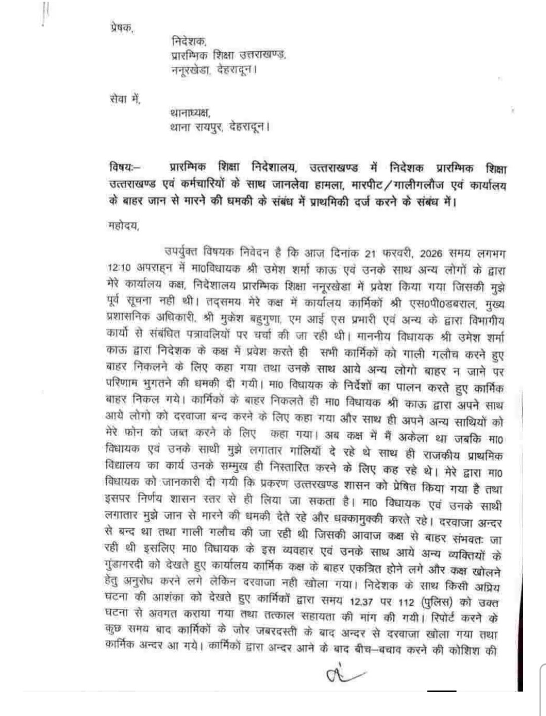 SEO Title: देहरादून निदेशालय हंगामा: विधायक उमेश शर्मा काऊ समेत समर्थकों पर FIR, जान से मारने की धमकी और मारपीट के आरोप