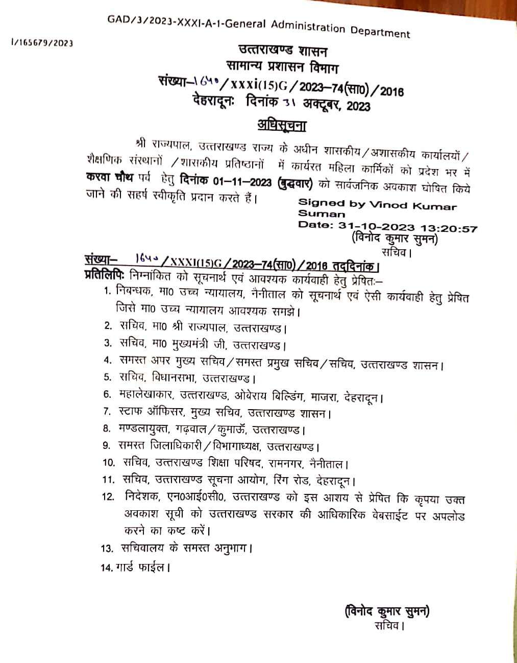 उत्तराखण्ड ब्रेकिंगः सरकार ने करवाचौथ पर महिला कर्मचारियों को दिया बड़ा तोहफा! कल 1 नवंबर को घोषित की छुट्टी, आदेश जारी