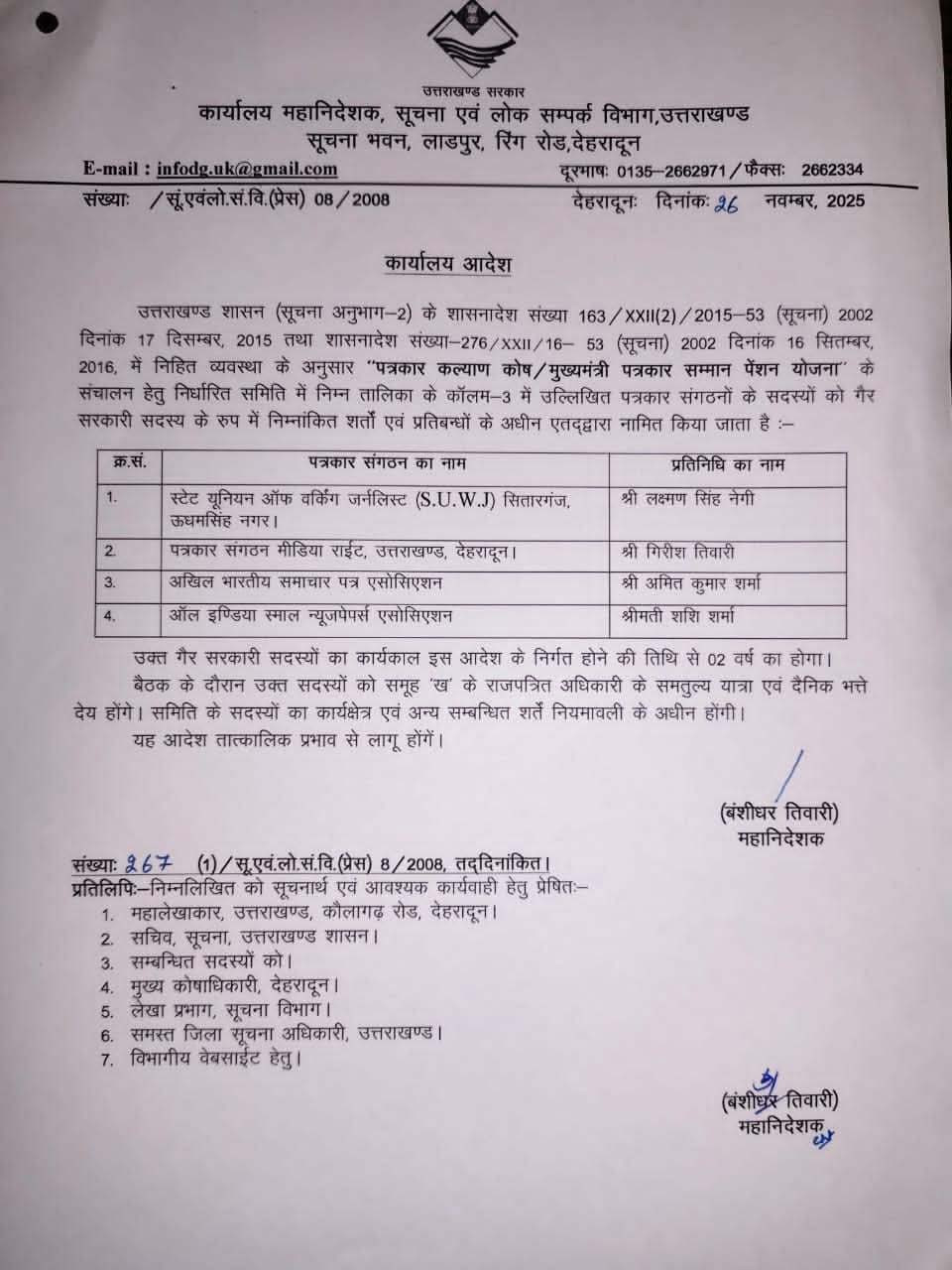 देहरादून। प्रदेश सरकार ने पत्रकारों की सामाजिक सुरक्षा एवं सम्मान सुनिश्चित करने के उद्देश्य से संचालित ‘पत्रकार कल्याण कोष/मुख्यमंत्री पत्रकार सम्मान पेंशन योजना’ के संचालन हेतु गठित समिति में चार गैर सरकारी सदस्यों को नामित किया है। चयनित सदस्यों का कार्यकाल दो वर्ष का होगा। इसको लेकर आदेश भी जारी हुआ है। सूचना एवं लोक सम्पर्क विभाग के महानिदेशक बंशीधर तिवारी द्वारा जारी कार्यालय आदेश के अनुसार स्टेट यूनियन ऑफ वर्किंग जर्नलिस्ट सितारगंज, ऊधम सिंह नगर से लक्ष्मण सिंह नेगी, पत्रकार संगठन मीडिया राईट, देहरादून से गिरीश तिवारी, अखिल भारतीय समाचार पत्र एसोसिएशन से अमित कुमार शर्मा, ऑल इंडिया स्माल न्यूजपेपर्स एसोसिएशन से शशि शर्मा को नियुक्त किया गया है। आदेश के अनुसार बैठक में इन सदस्यों को समूह-‘ख’ के राजपत्रित अधिकारी के समतुल्य यात्रा एवं दैनिक भत्ता देय होगा। समिति से संबंधित अन्य सभी कार्यक्षेत्र एवं दायित्व संबंधित नियमावली के तहत निर्धारित होंगे।