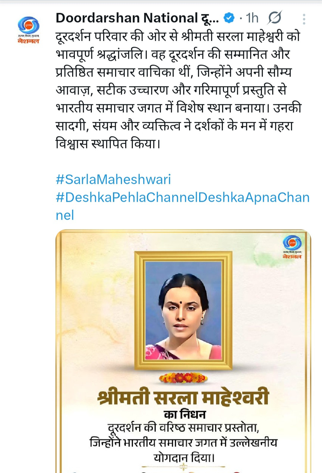 दूरदर्शन की लोकप्रिय और वरिष्ठ न्यूज रीडर सरला माहेश्वरी का निधन हो गया है। उनके निधन को भारतीय टेलीविजन पत्रकारिता के स्वर्णिम दौर के अंत के रूप में देखा जा रहा है। सरला माहेश्वरी उन चुनिंदा समाचार वाचकों में शामिल थीं, जिन्होंने समाचार प्रस्तुति को गरिमा, विश्वसनीयता और संतुलन की नई पहचान दी।